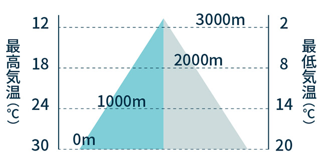 標高3000mでは最高気温が12度、最低気温が2度になります。