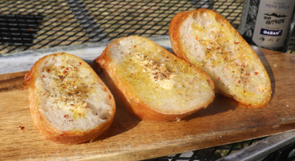 - ■輪切りにしたフランスパンにバターを塗り、スパイスを一振りすると、絶品バケットに早変わり。ガーリックの香ばしさと、程よい塩気がクセになる美味しさを演出。お酒も進みます。