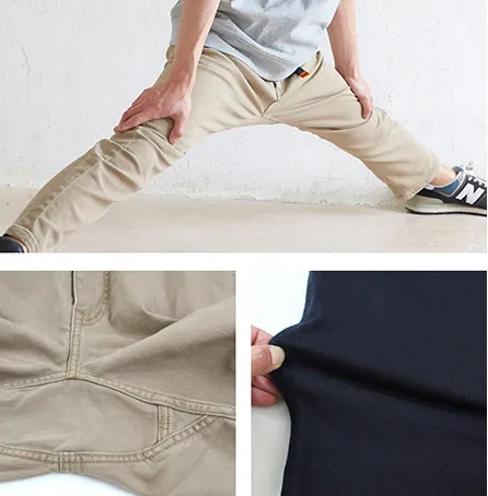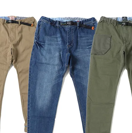 クライミングシリーズでは、可動域を広げる縫製パターンであるガゼットクロッチを採用。生地は厚手でしっかりとした質感でありながらも、伸縮性のあるオリジナルツイル生地を使用。この二つの組み合わせにより180度開脚が可能な程に。ウエスト部分には、着脱の際には片手で簡単に開閉し、ウエストサイズにあわせて微調整できるウェビングベルトデザインを使用しております。