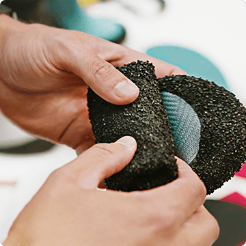 インソール部分には耐摩耗性のポリマーを使用しています。ポリマーは液体の状態で最適温度に加熱され、メッシュ部分に塗布されます。そこへさらに粒子状のポリマーを重ねていきます。 この材質と工程により、非常に強度のあるソールが完成するのです。 ※材料の余剰の関係から、使い始めはポリマーが多少剥がれ落ちます。数回使用すると馴染むため、その後は剥がれてくる心配はほとんどありません。